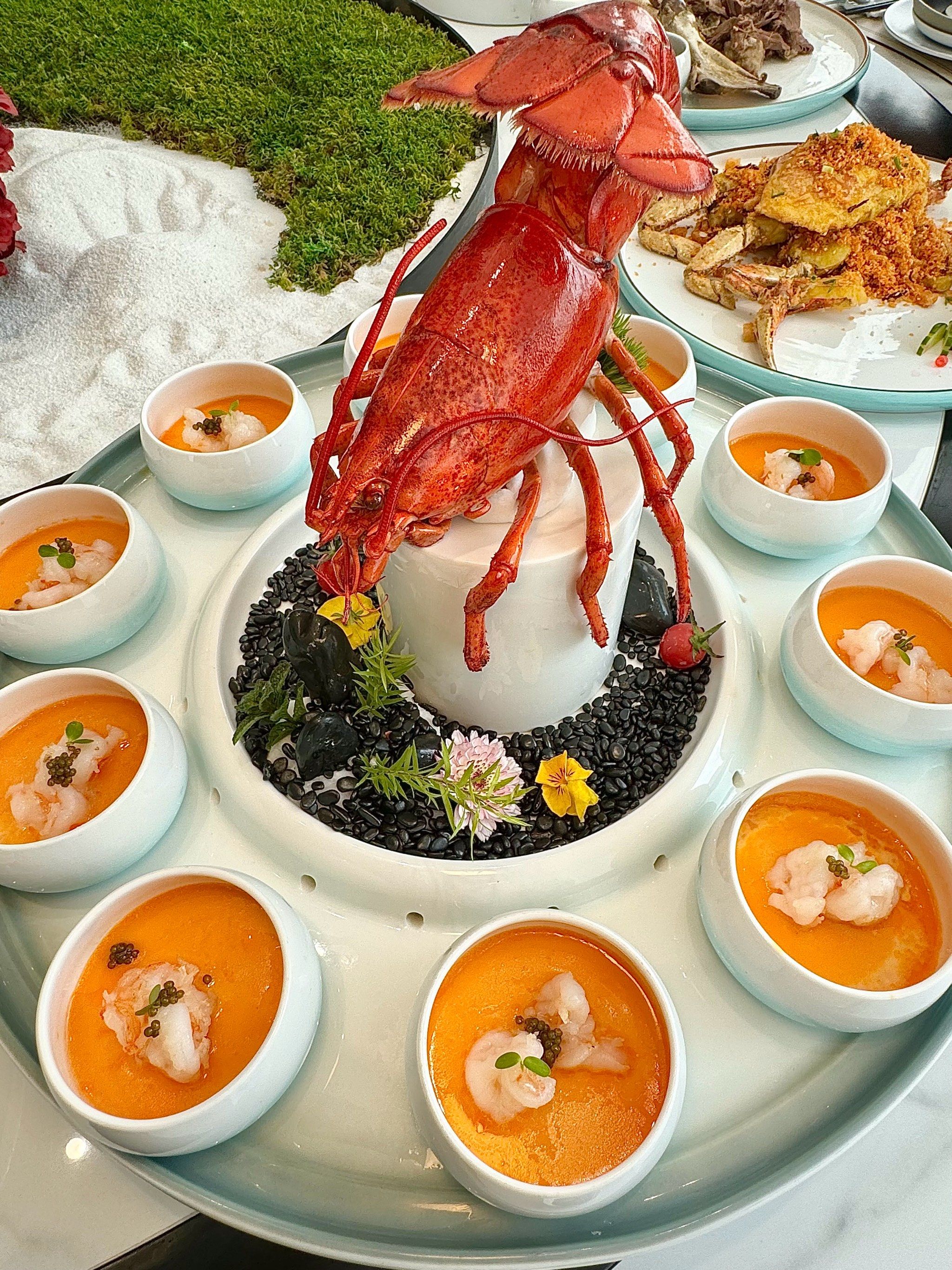 4另起油锅把黄油葱,姜,大蒜一起抄,最后放入芝士,龙虾拼盘摆好均匀撒入汁水,上桌