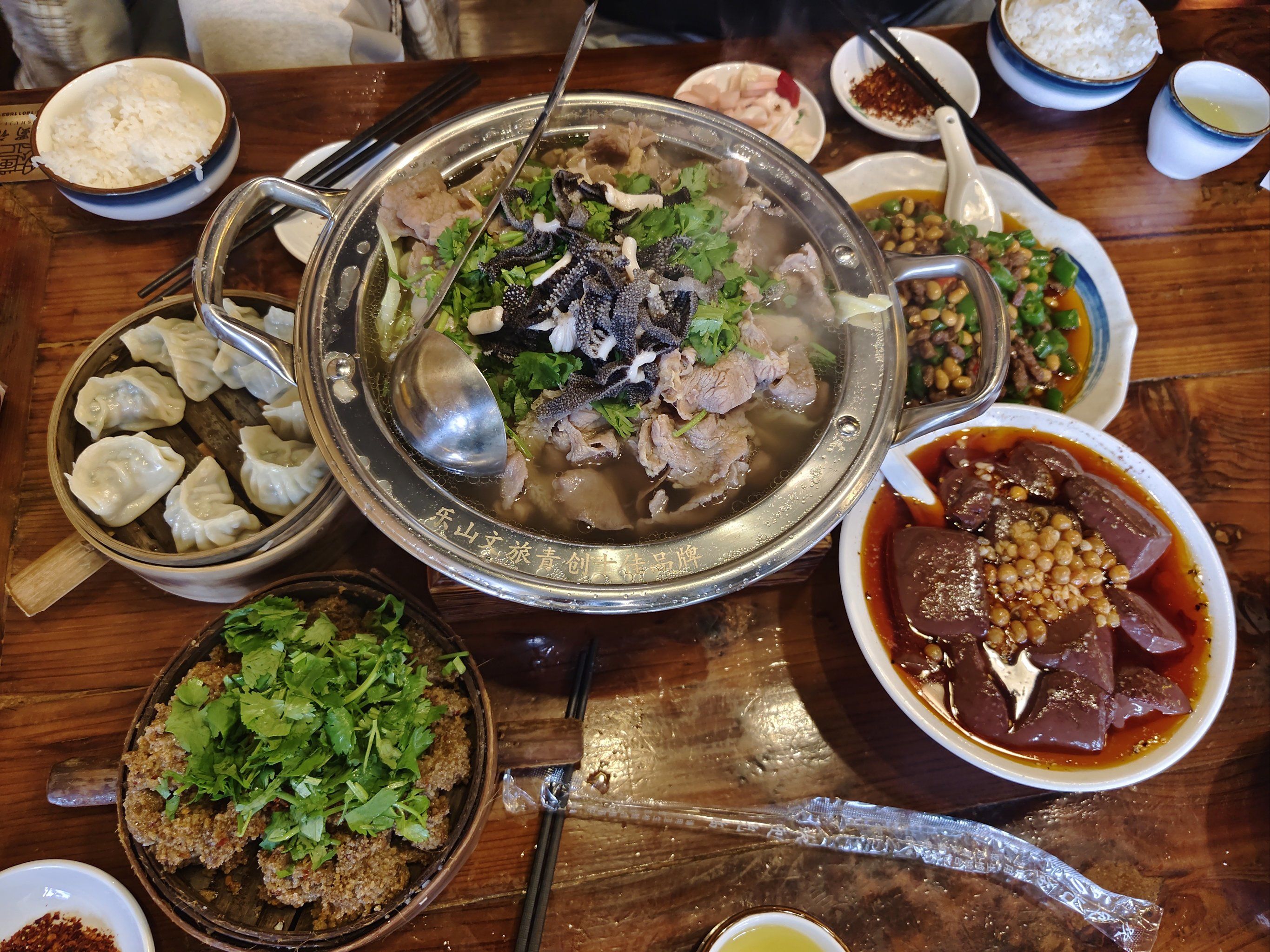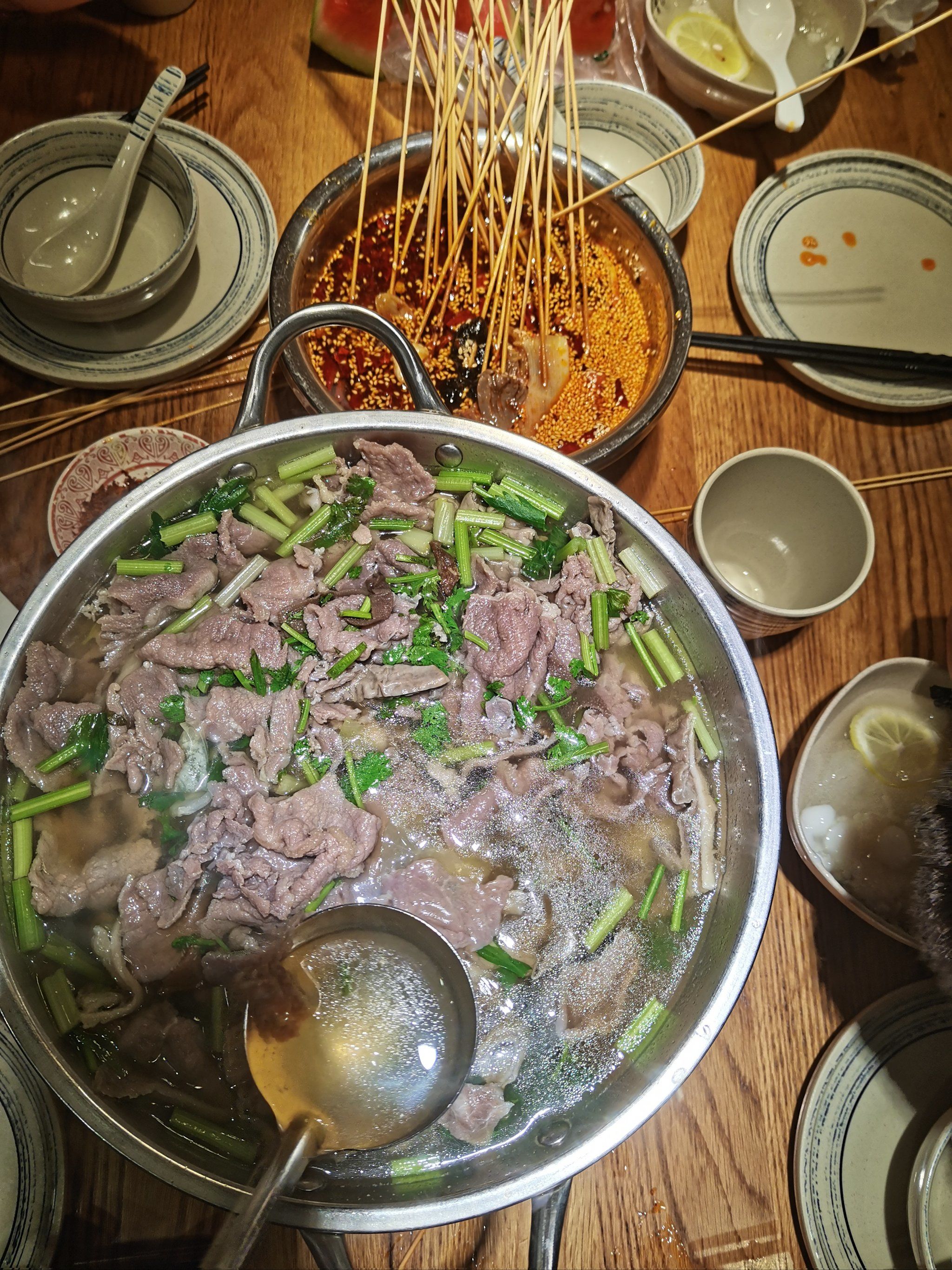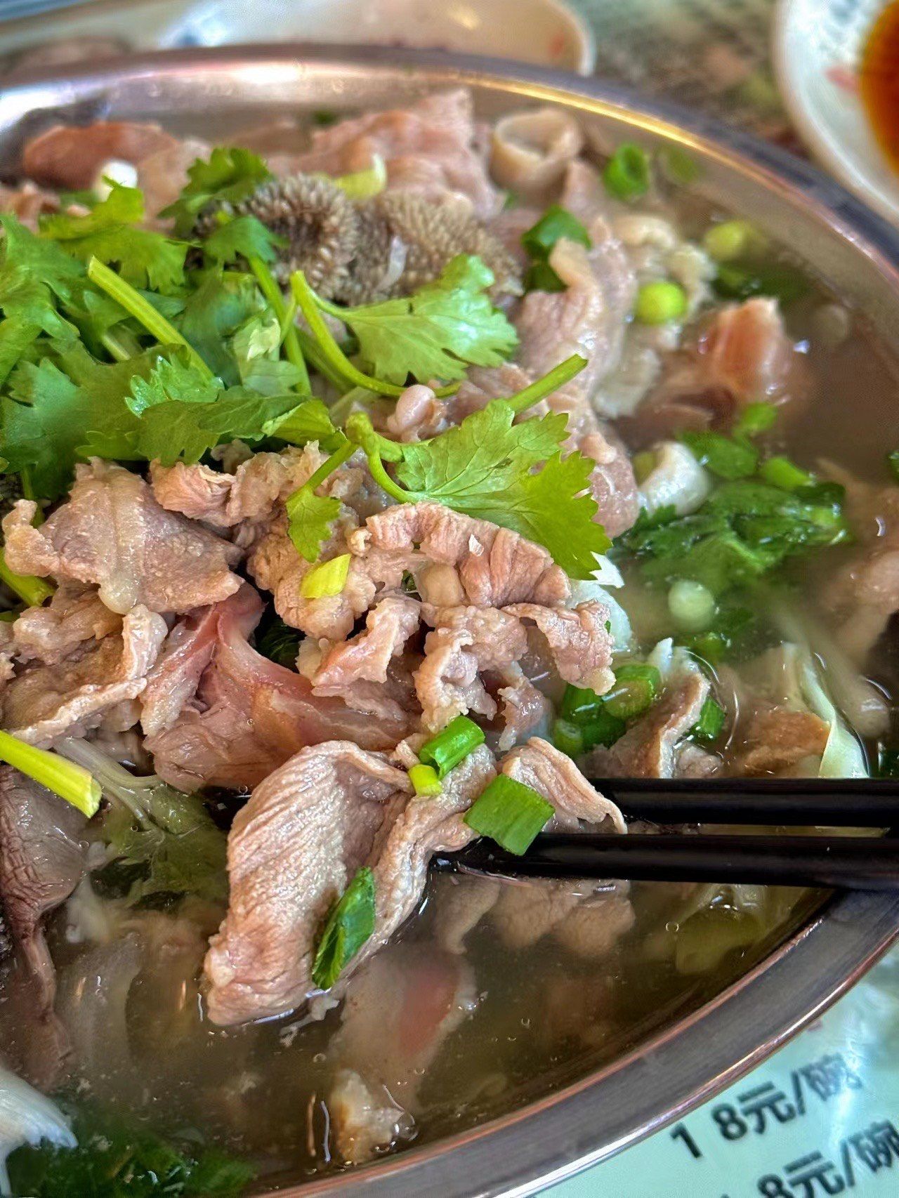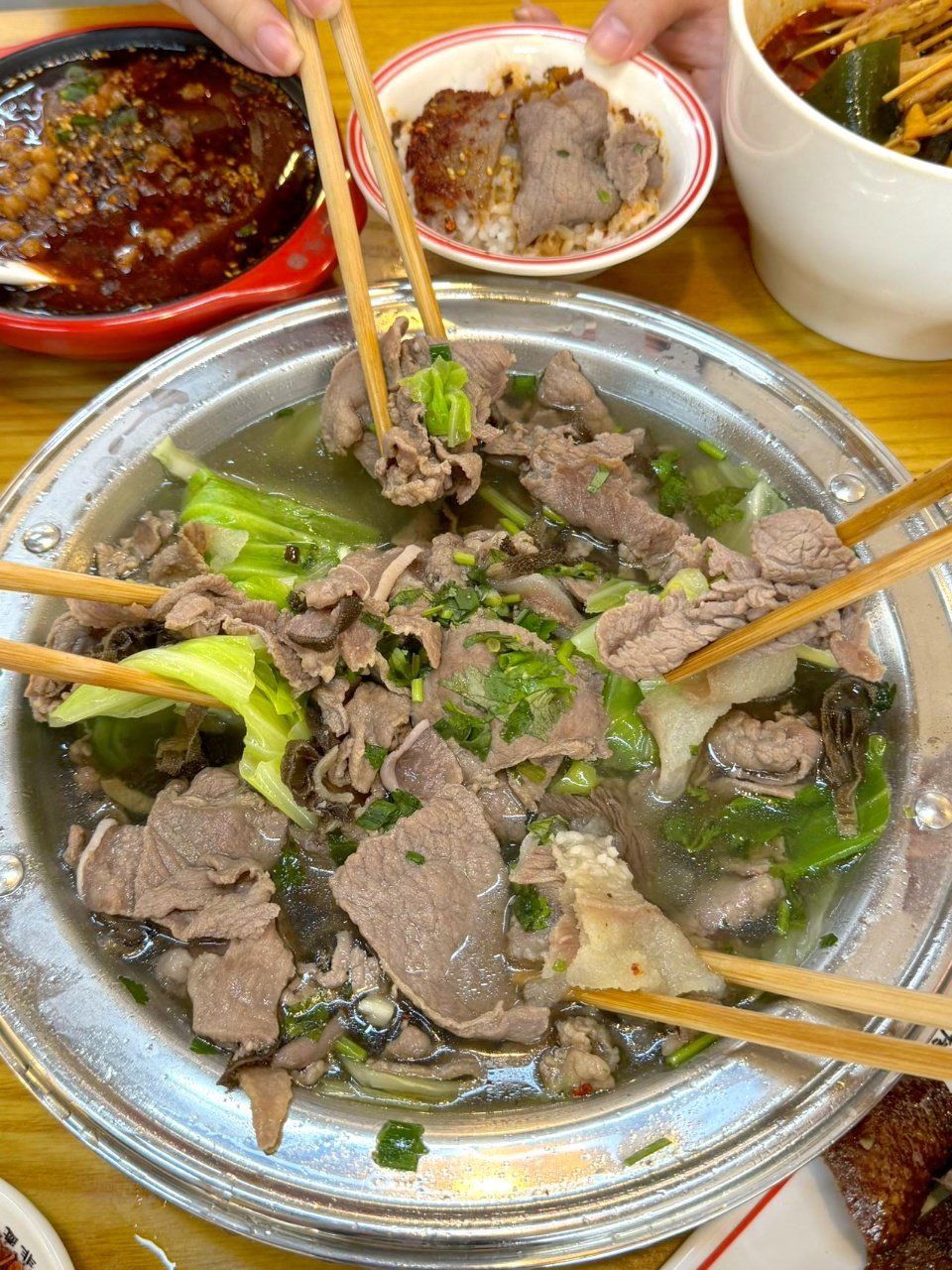 烫制:将切好的食材放入专用的小竹篓或大漏勺中,在滚烫的牛肉汤中烫制。牛肉片烫5-8秒,牛百叶烫1分钟,牛杂烫40分钟。
