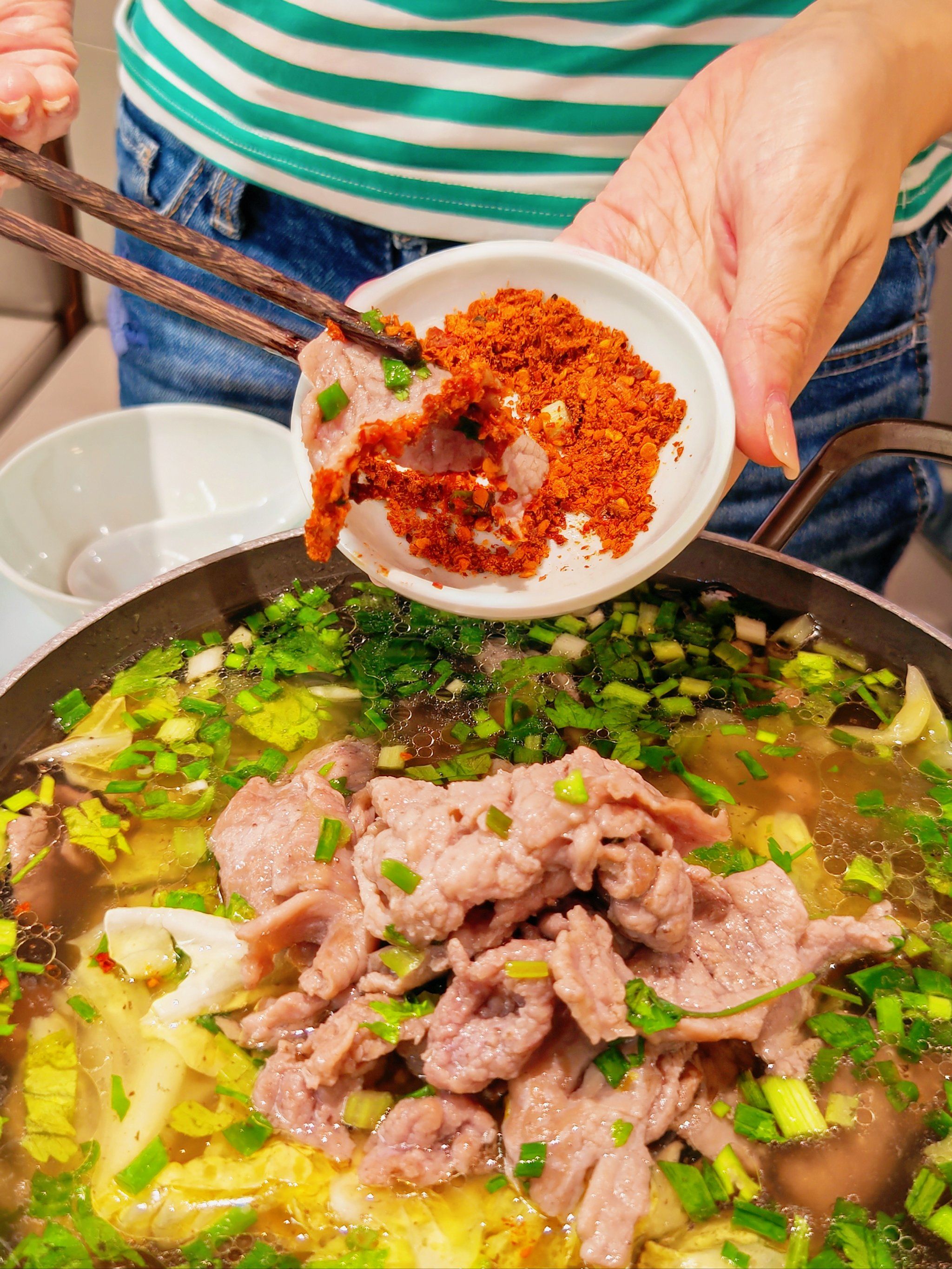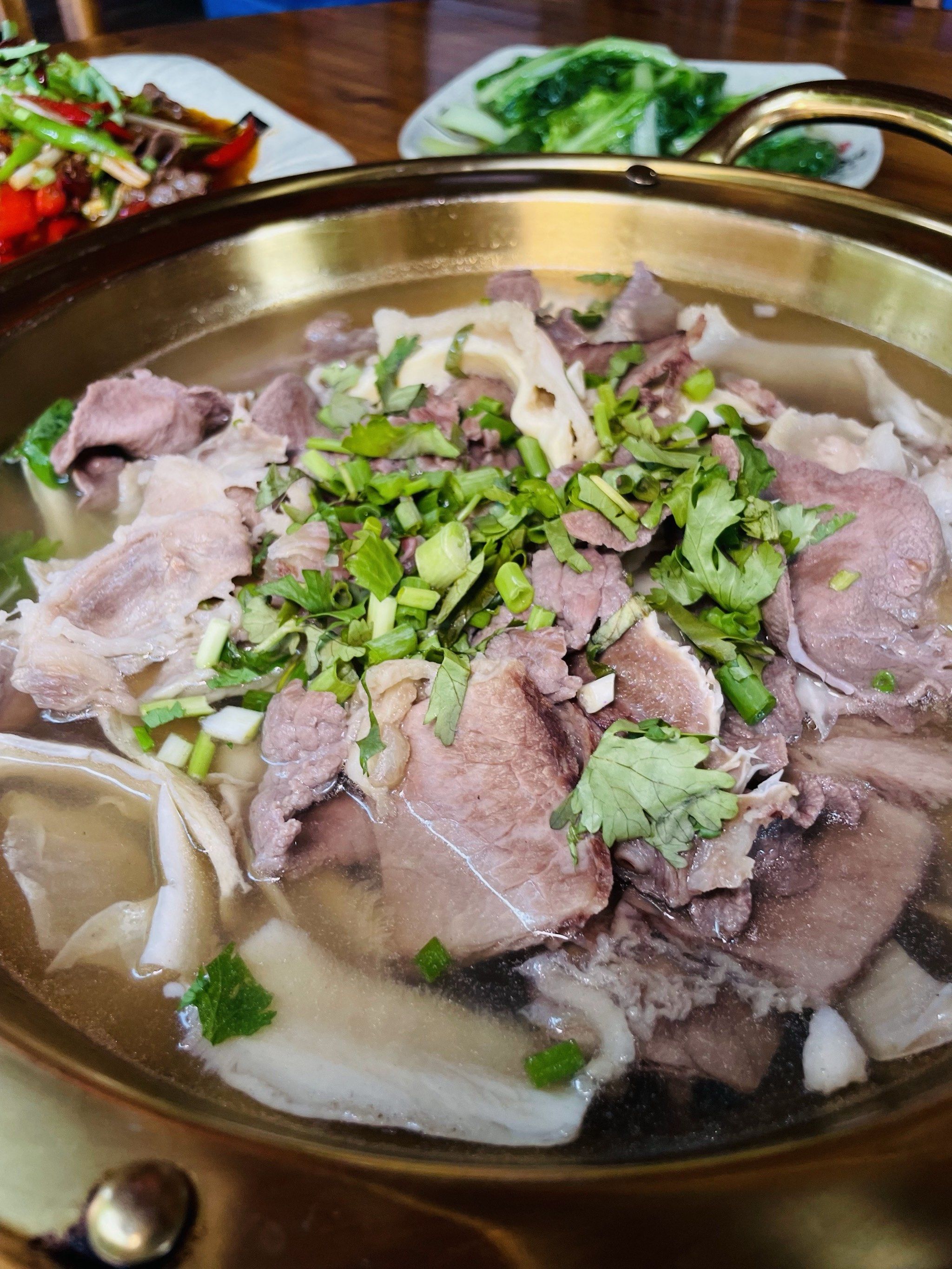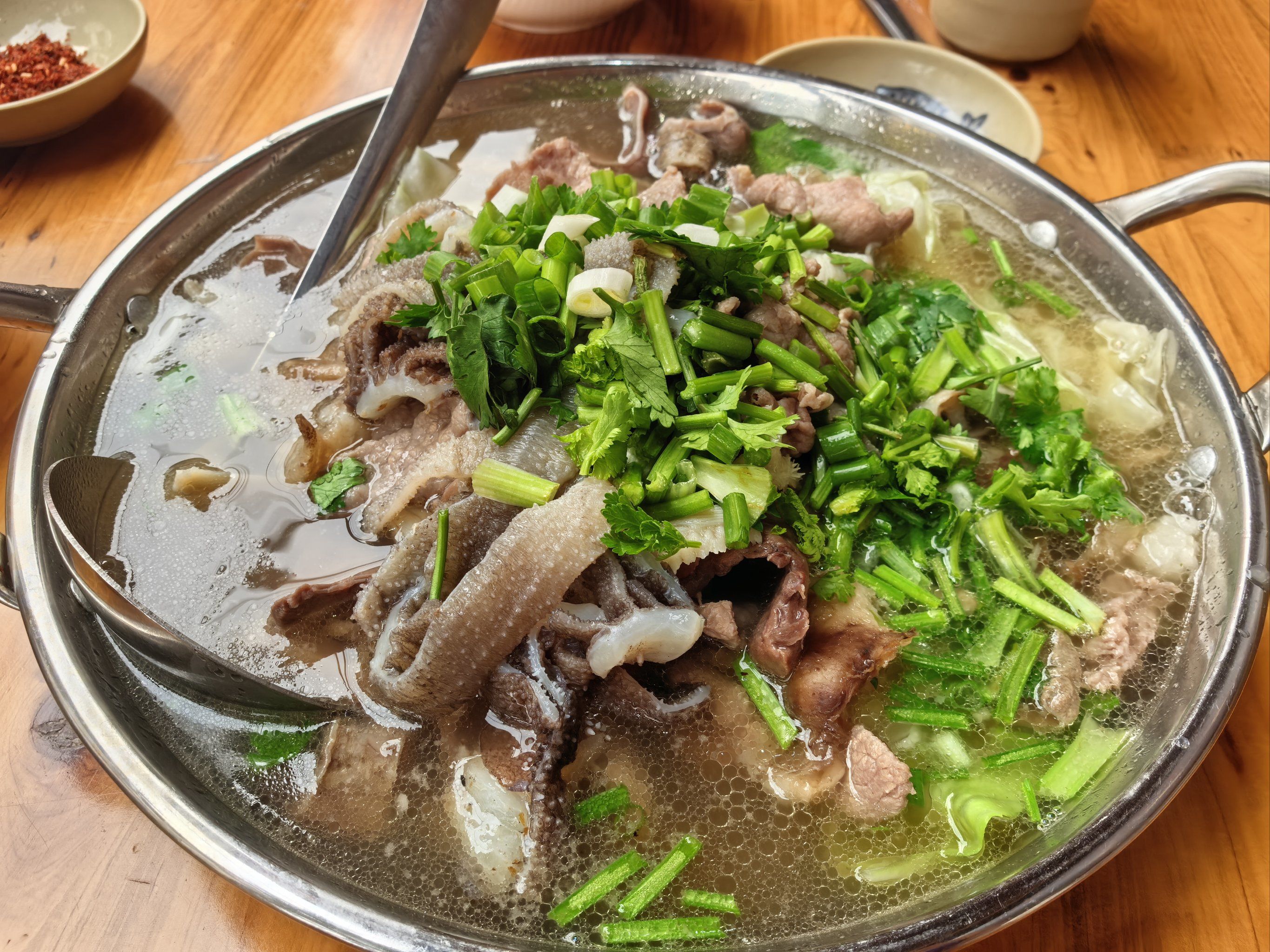 上桌:将烫好的牛肉、牛杂等食材连同汤一起上桌,搭配辣椒面蘸料享用。