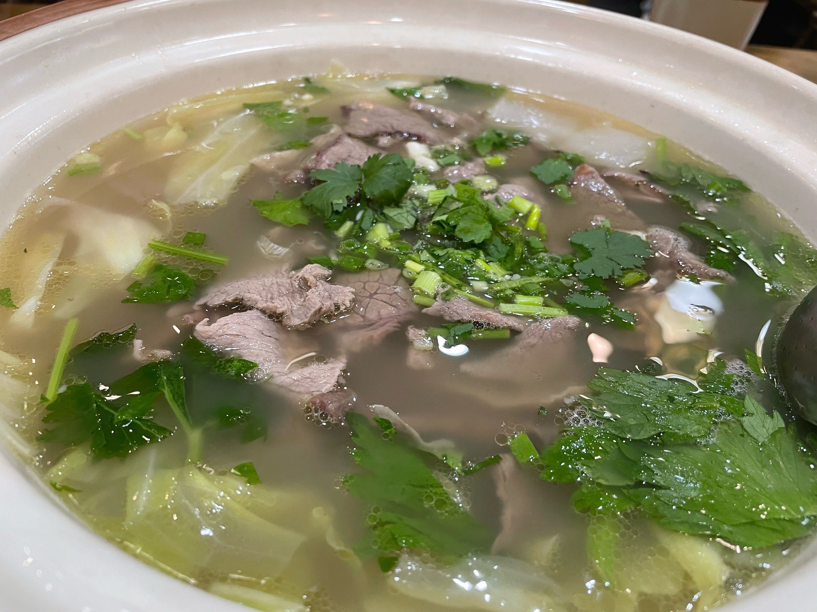 当有客人来时,先用勺在大铁锅里舀汤盛入小碗,等到撒入适量的香菜末或葱花后,即上桌让客人先喝汤。