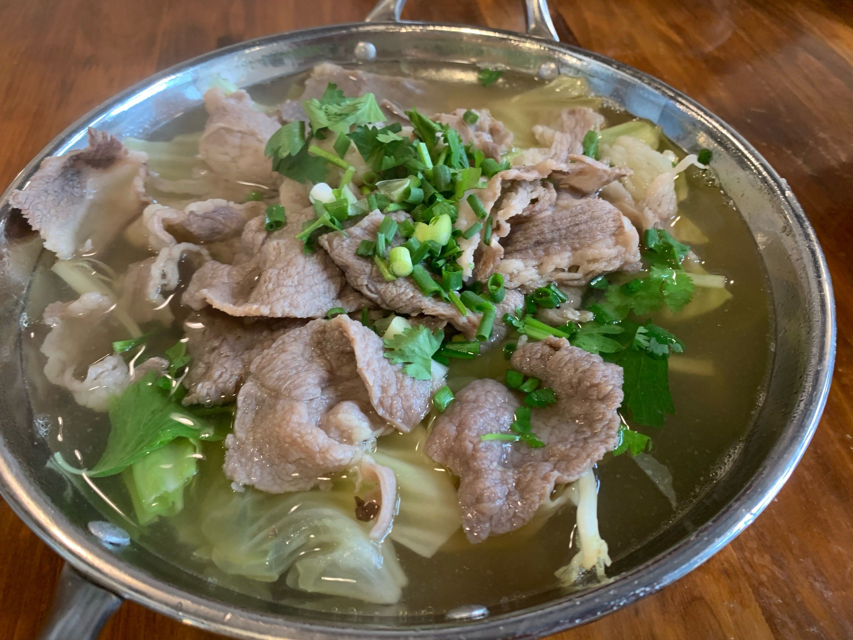 如果是“碗碗牛肉”吃法,就把客人所点牛肉、牛杂分别放铁锅汤的大漏勺里,烫断生或烫热后,分别盛入垫有芹菜节的土碗里,舀入适量的滚汤,撒香菜配味碟一起上桌。