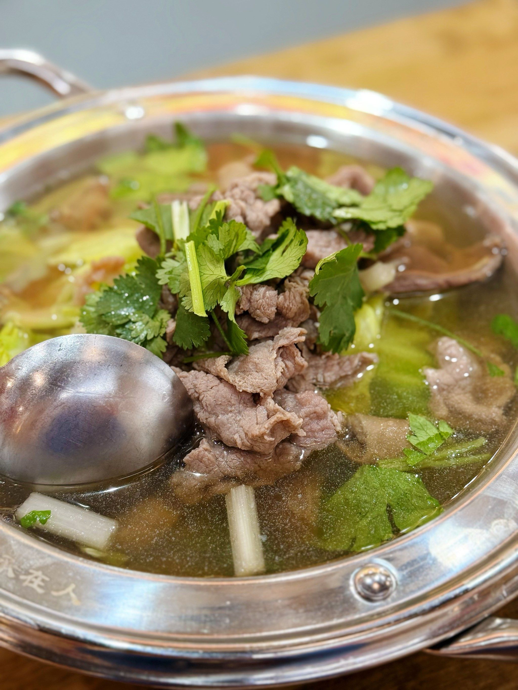 舀入适量的滚汤并撒上香菜节,配味碟一起上桌,边加热边食。