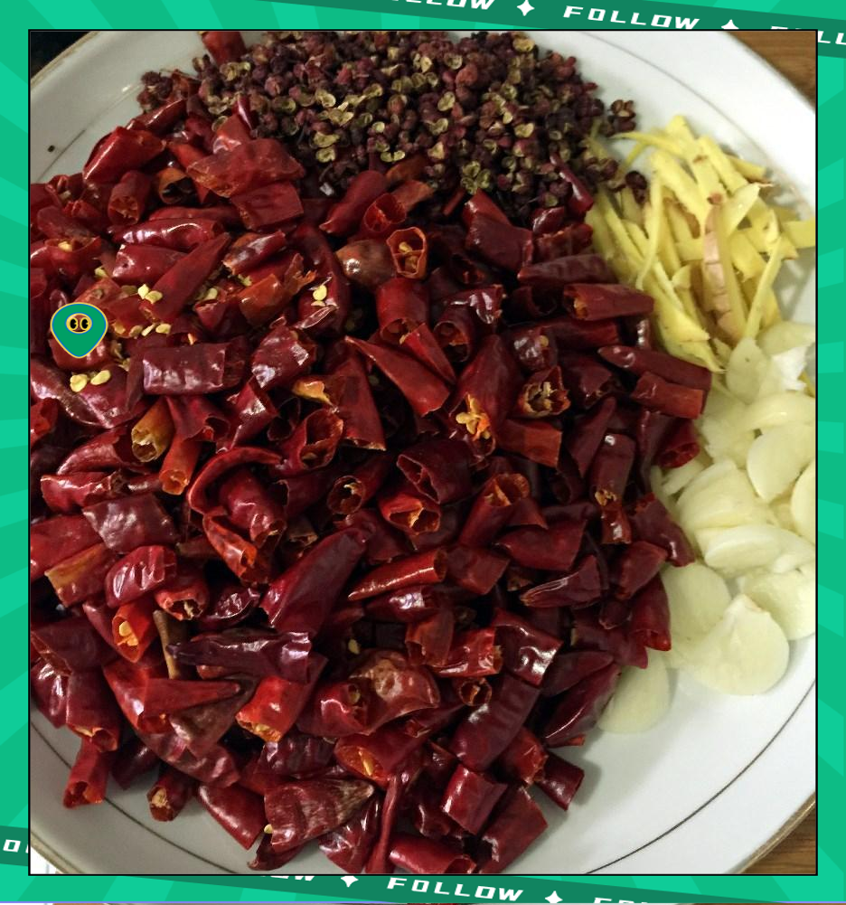 锅内留底油,下入葱姜蒜爆香后下入花椒粒炒香,下入干辣椒,转小火将辣味炒出来,注意火不能大,否则辣椒容易糊,