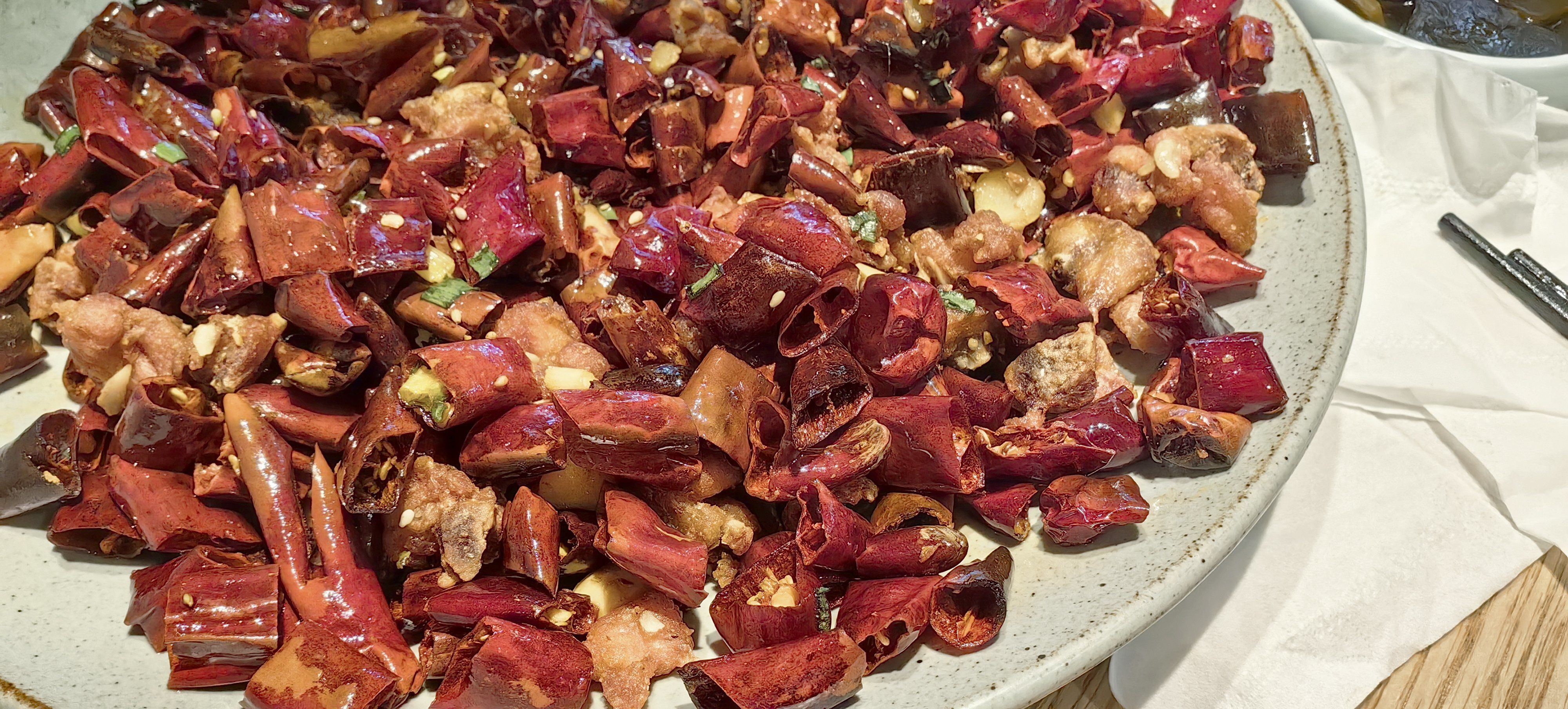 用料 : 鸡翅根 去骨取肉净重150克、 红花椒 10克、 朝天椒(干) 100克(怕辣可减)、 盐 1/4茶匙、 生抽 1茶匙、 料酒 3汤匙、 生姜 4-5片、 蒜 8-9瓣、 菜籽油 足量,炸东西你懂的、 红油 视个人喜好、 砂糖 视个人喜好