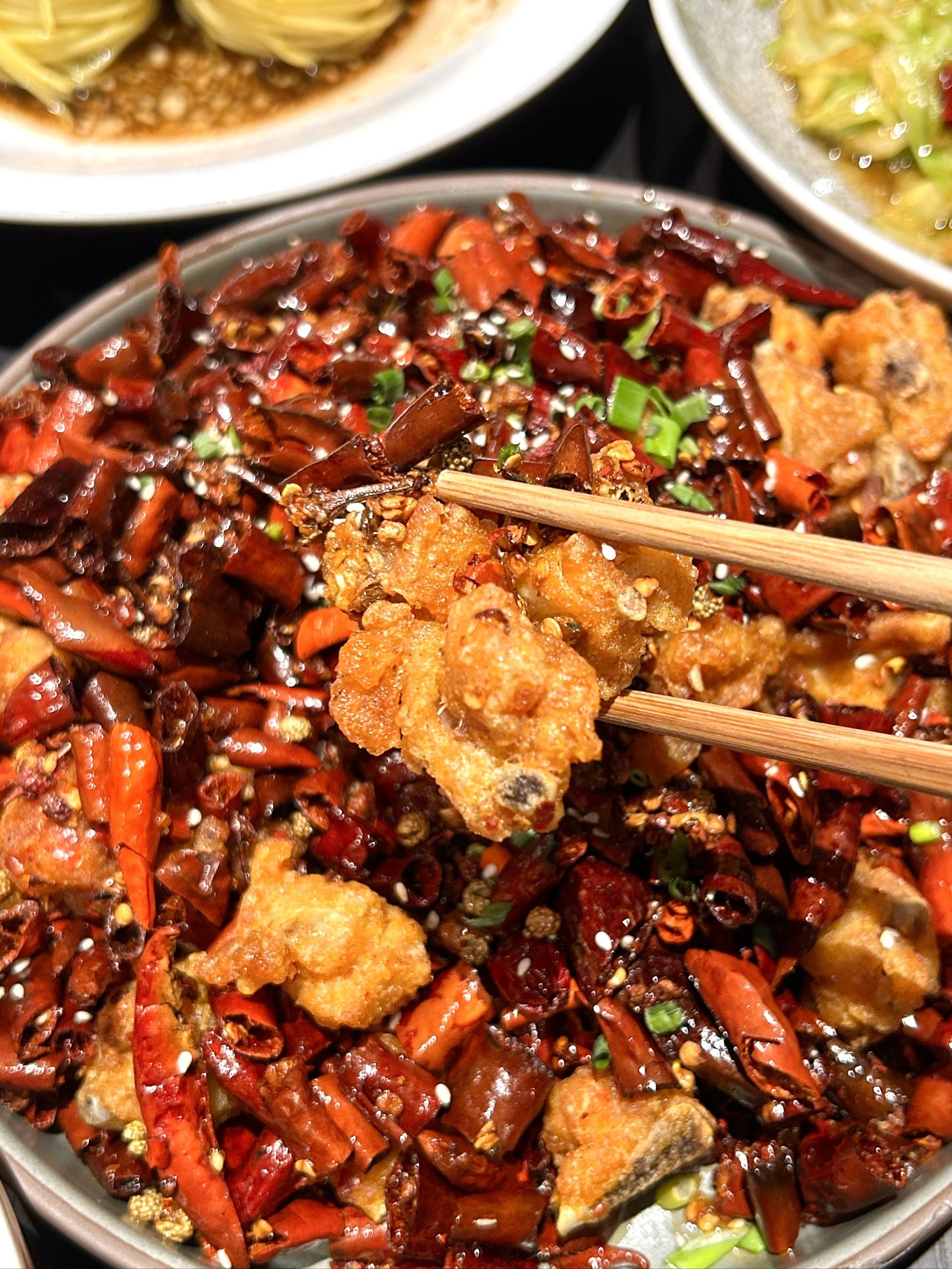 炒制:锅中留少许底油,放入姜蒜爆香,加入干辣椒和干花椒炒出香味,倒入炸好的鸡块翻炒均匀,加入适量白糖、鸡精调味即可。