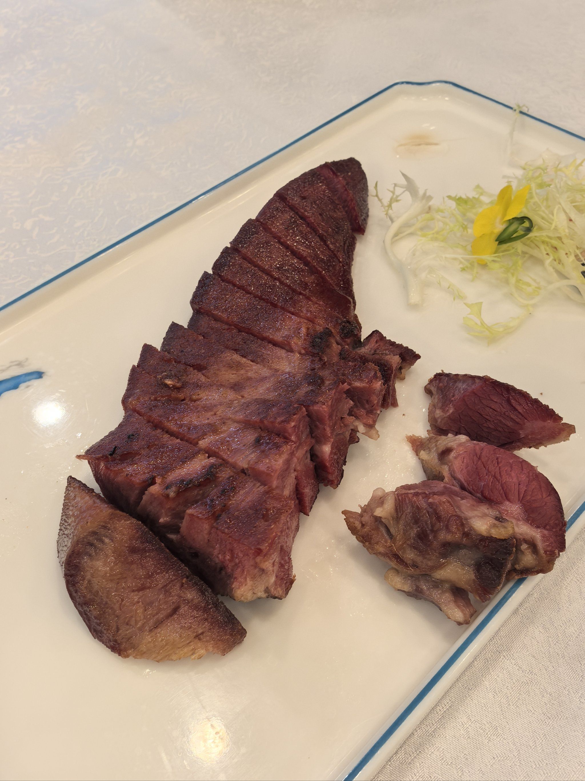 最后,将鸭子切成3厘米长、1.5厘米宽的小条装盘,鸭皮朝上盖在鸭颈上,摆成鸭形。
