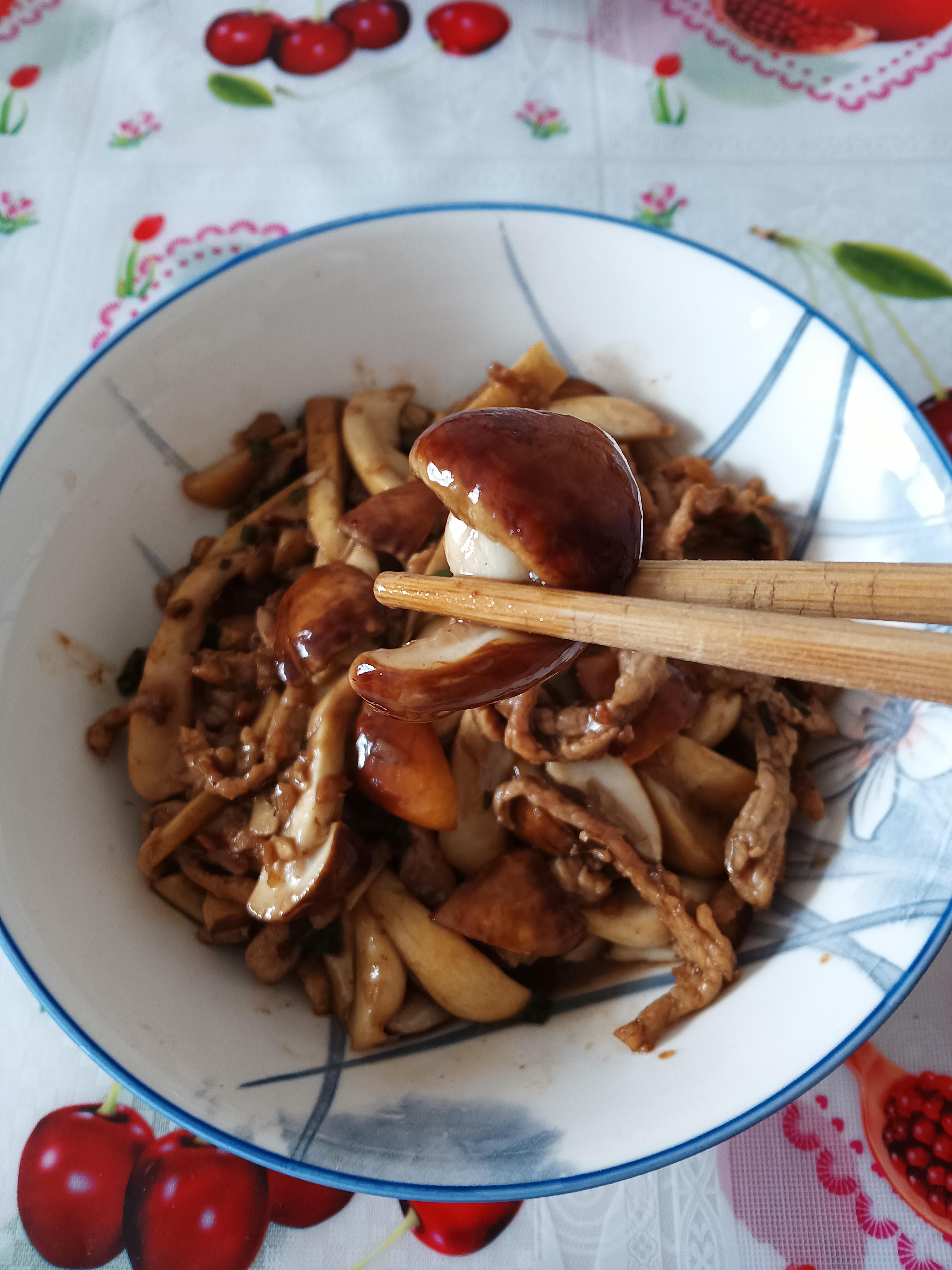 所需材料:赤松茸500克、猪肉100克、黄瓜半根、胡萝卜1段、油适量、葱1段、姜2片、大蒜2瓣、料酒半汤匙、蚝油1汤匙、生抽1汤匙、水淀粉适量、