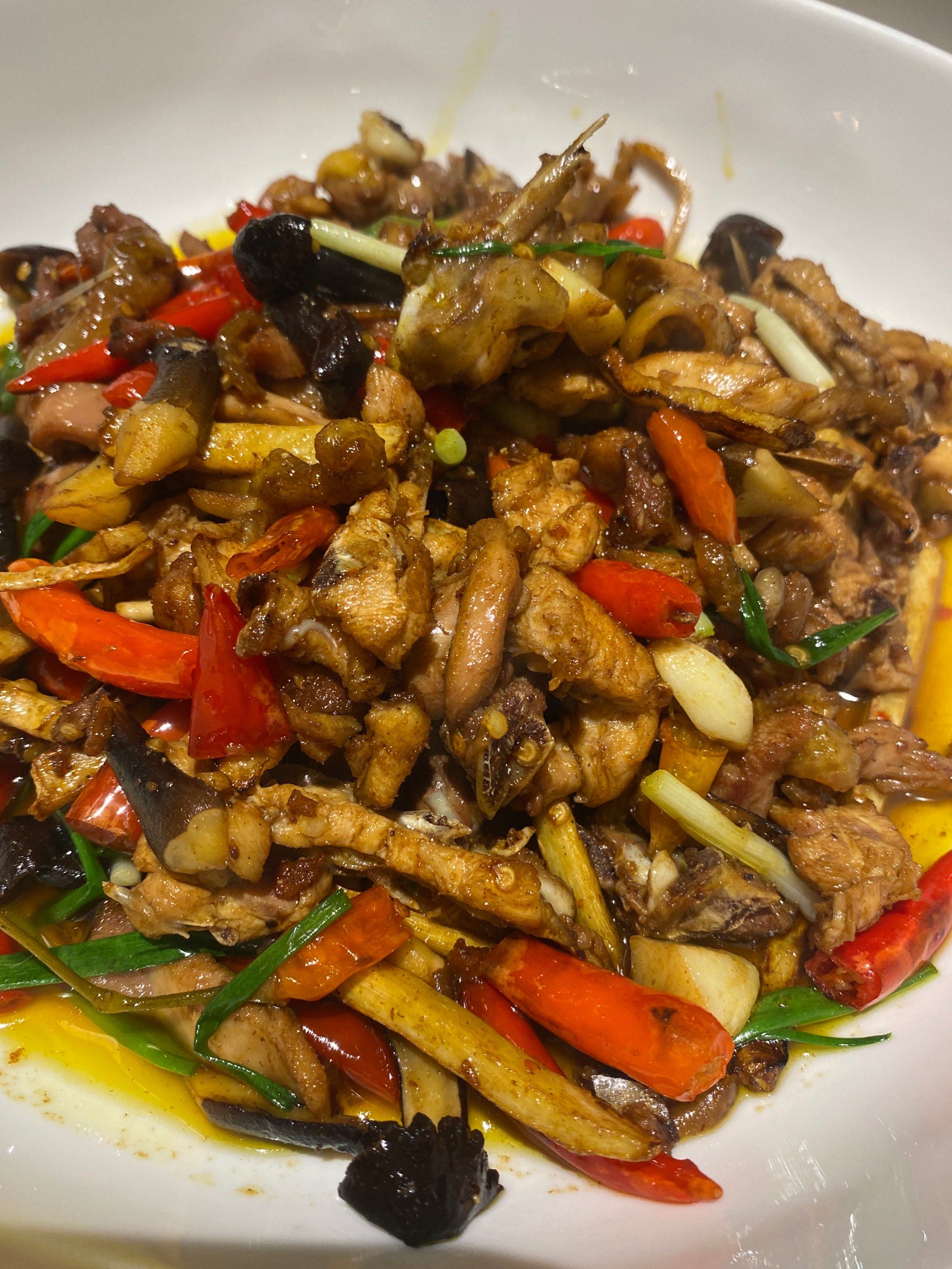 6、放入鸡肉 蒜片 糖 盐 鸡精 料酒 生抽继续翻炒,最后加入尖椒翻炒出锅
