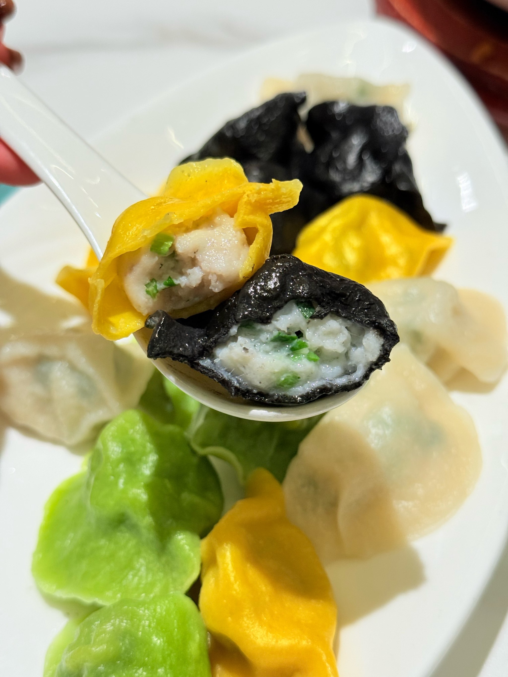食材:比目鱼鱼片600克,赤松茸6-8只,香葱一小把,饺子皮适量