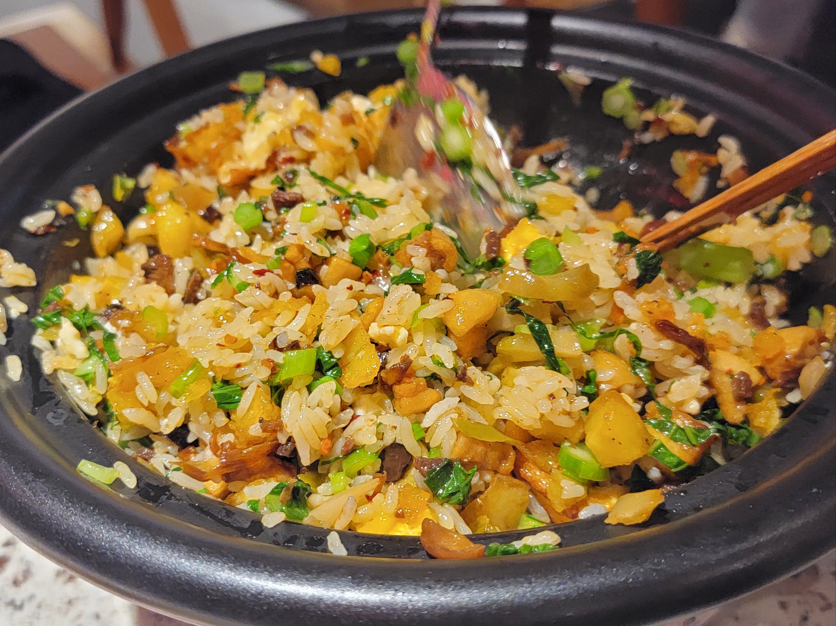 7、饭煮好后,打开锅盖,淋上酱汁,撒上葱花,用勺子搅拌均匀,关火,可以享用美味的松茸煲仔饭了。