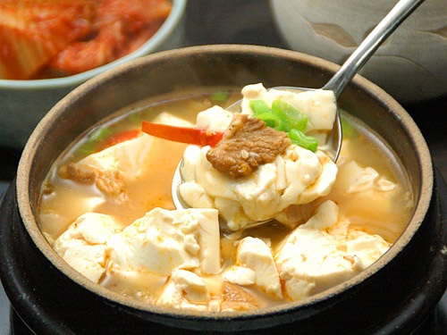 原料: 虾仁50g,扇贝丁50g,蟹肉棒50g,海蛎肉50g,豆腐250g,青椒10g,红椒10g,大葱5g,生姜3g,食盐5g,味精2g,蚝油10g,淀粉15g,老抽2g,料酒5g,清汤200g,明油5g,花生油500g(实耗35g)。