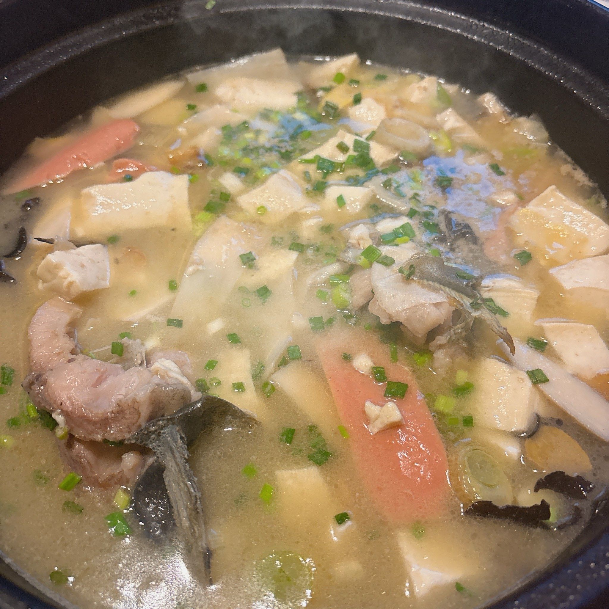 5.可以上锅了。锅内撒上葱花,先煮鱼皮,跟涮羊肉一样,涮好的鱼皮爽脆可口。后煮鱼片,最后可以再煮面块(强力推荐,用面粉和的死面)和其他蔬菜(金针菇等)。