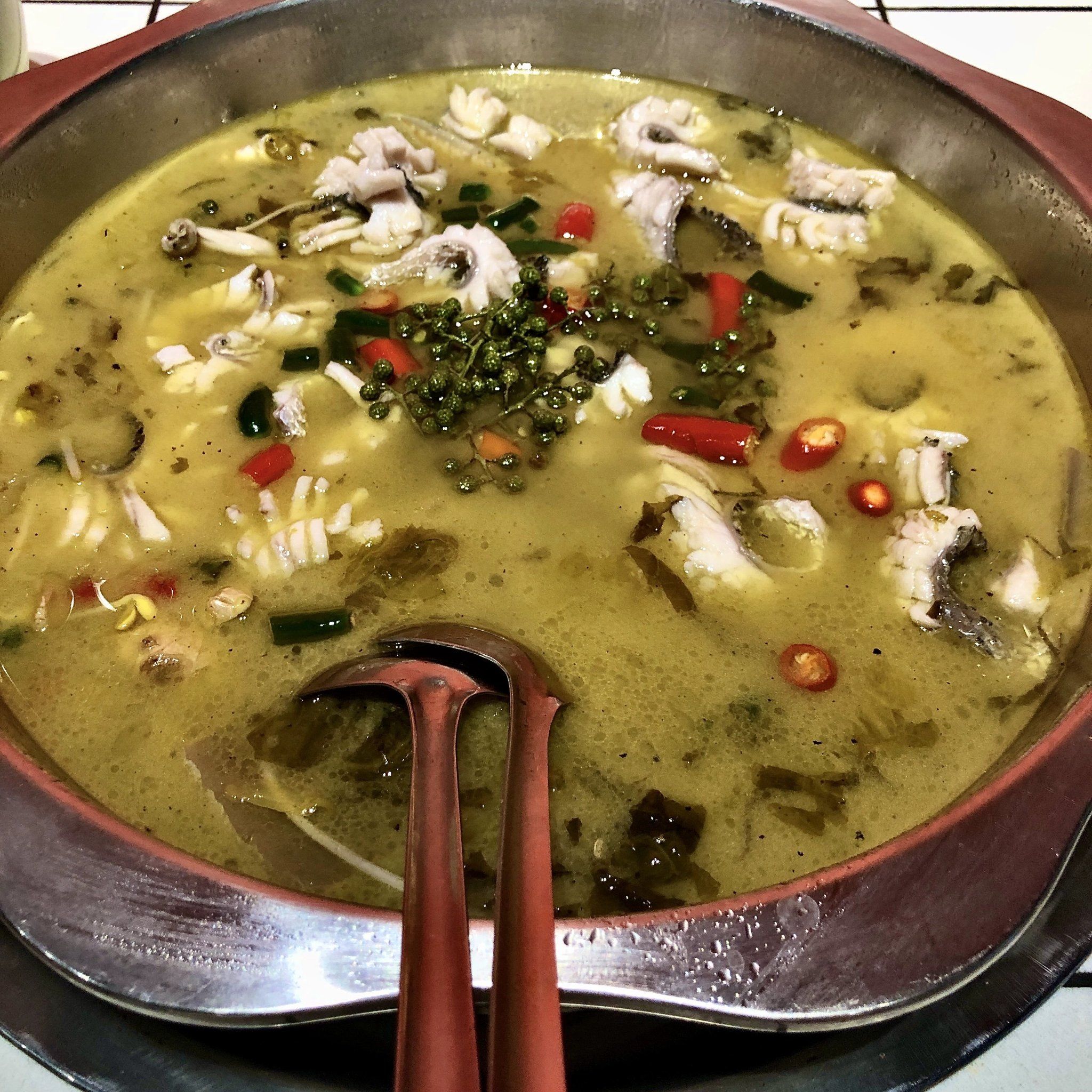 调料: 去皮姜片、葱末、精盐各5克,葱段片、去蒂野山椒各10克.味精3克,鸡精2克,绍酒15克,发酵酸汤1千克,清汤500克。