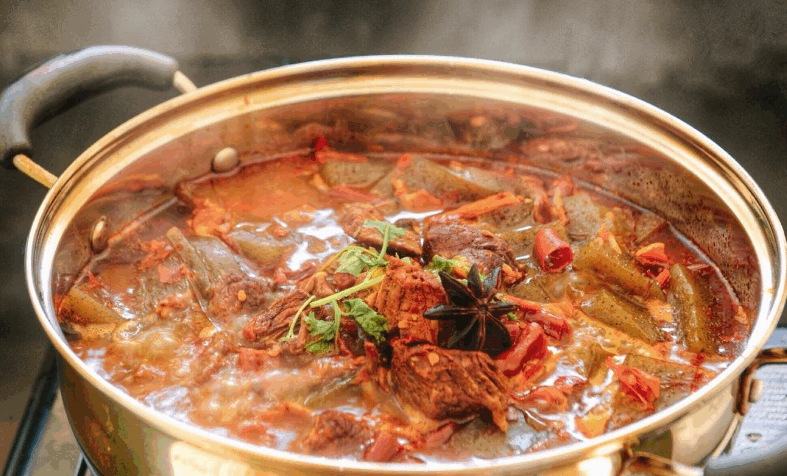 炒锅烧热,先下花椒粒和豆瓣酱,炒出香味,加肉汤煮沸,捞出花椒与豆瓣渣。