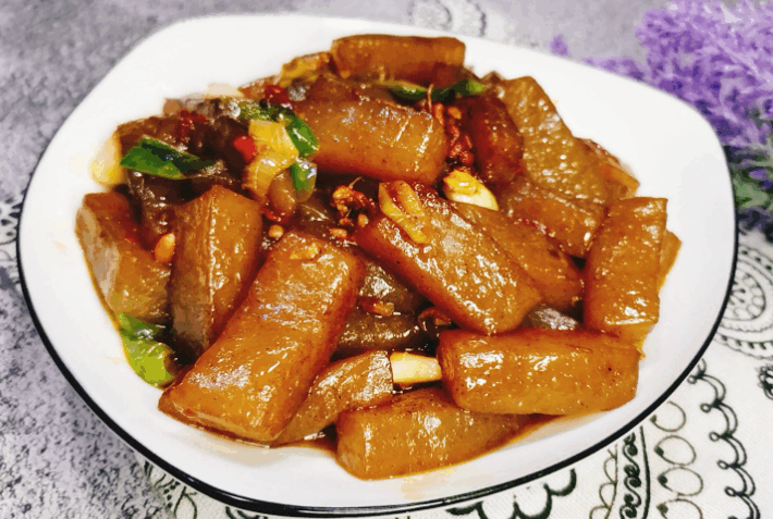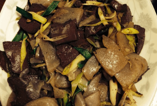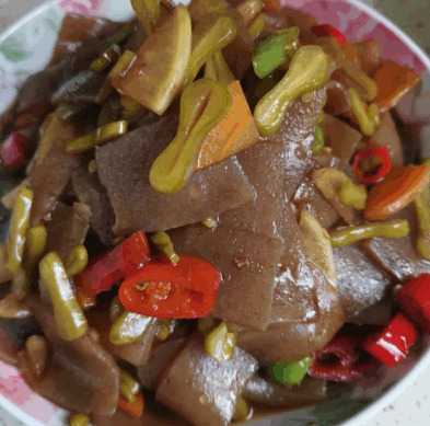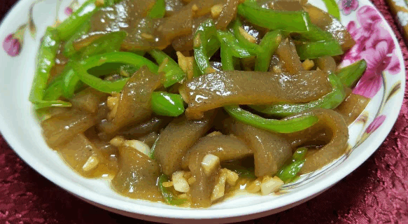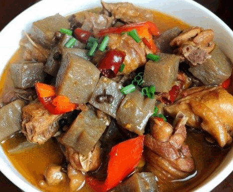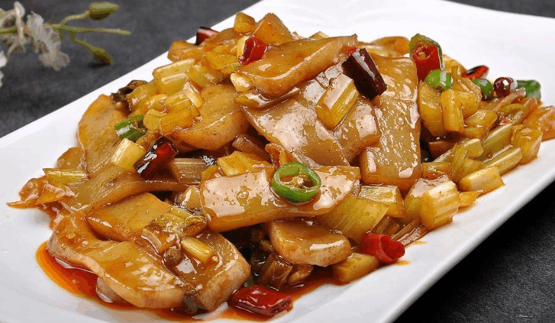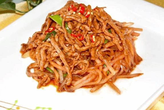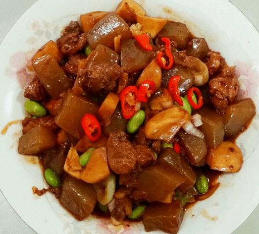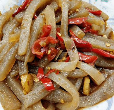 原料:猪里脊肉、魔芋、大蒜、姜、二荆条、色拉油、盐、鸡精、生抽、老抽、淀粉。