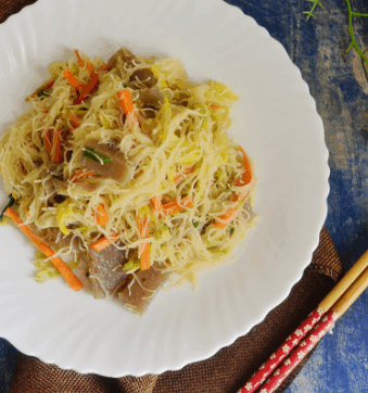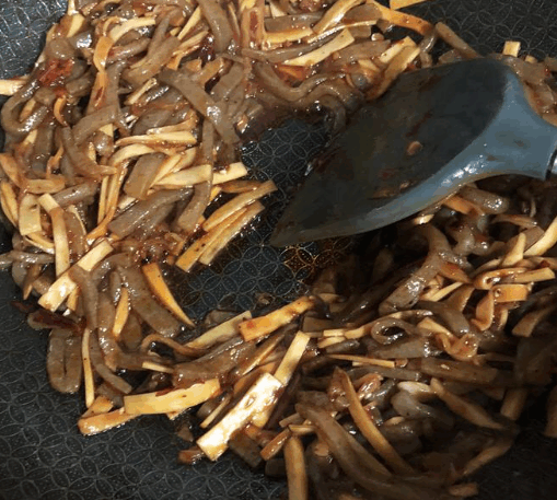 4、待红烧肉快熟时放入魔芋丝,加少许盐、糖调味,大火收汁,出锅装盘即可,撒红椒丝、香葱末点缀;