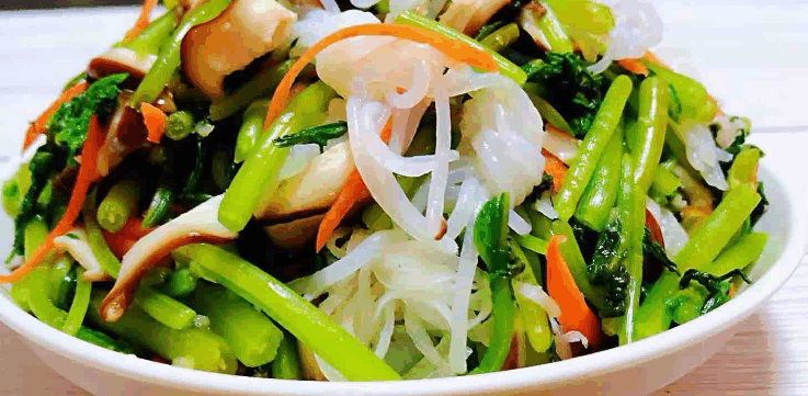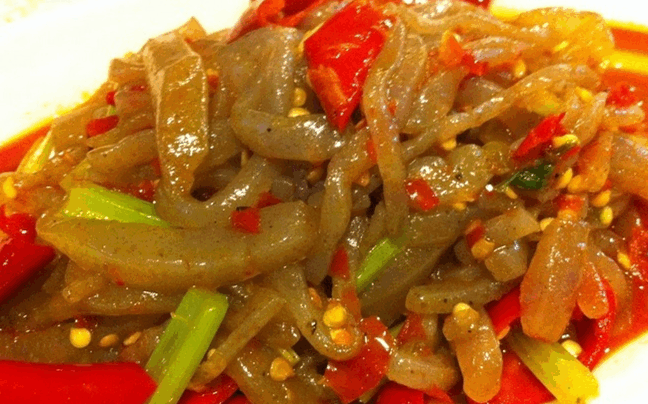 2、 坐锅点火倒油,油热后放入泡辣椒、葱、姜丝、猪肉丝翻炒,待猪肉变色后放入魔芋、香菇丝、青椒丝、水、盐、胡椒粉、淀粉、鸡精炒熟出锅,食用时淋上辣椒油即可。