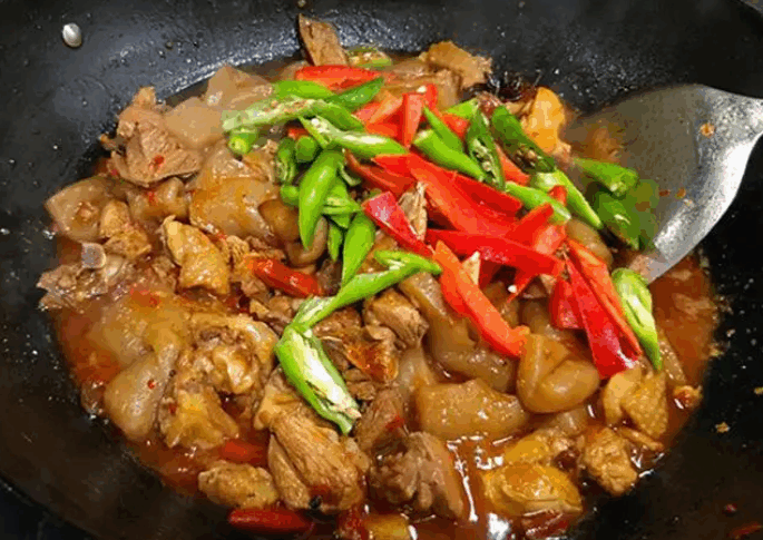 6. 盖上锅盖,小火焖烧到鸭肉软透时,调入盐与白糖,大火收汁即可出锅。